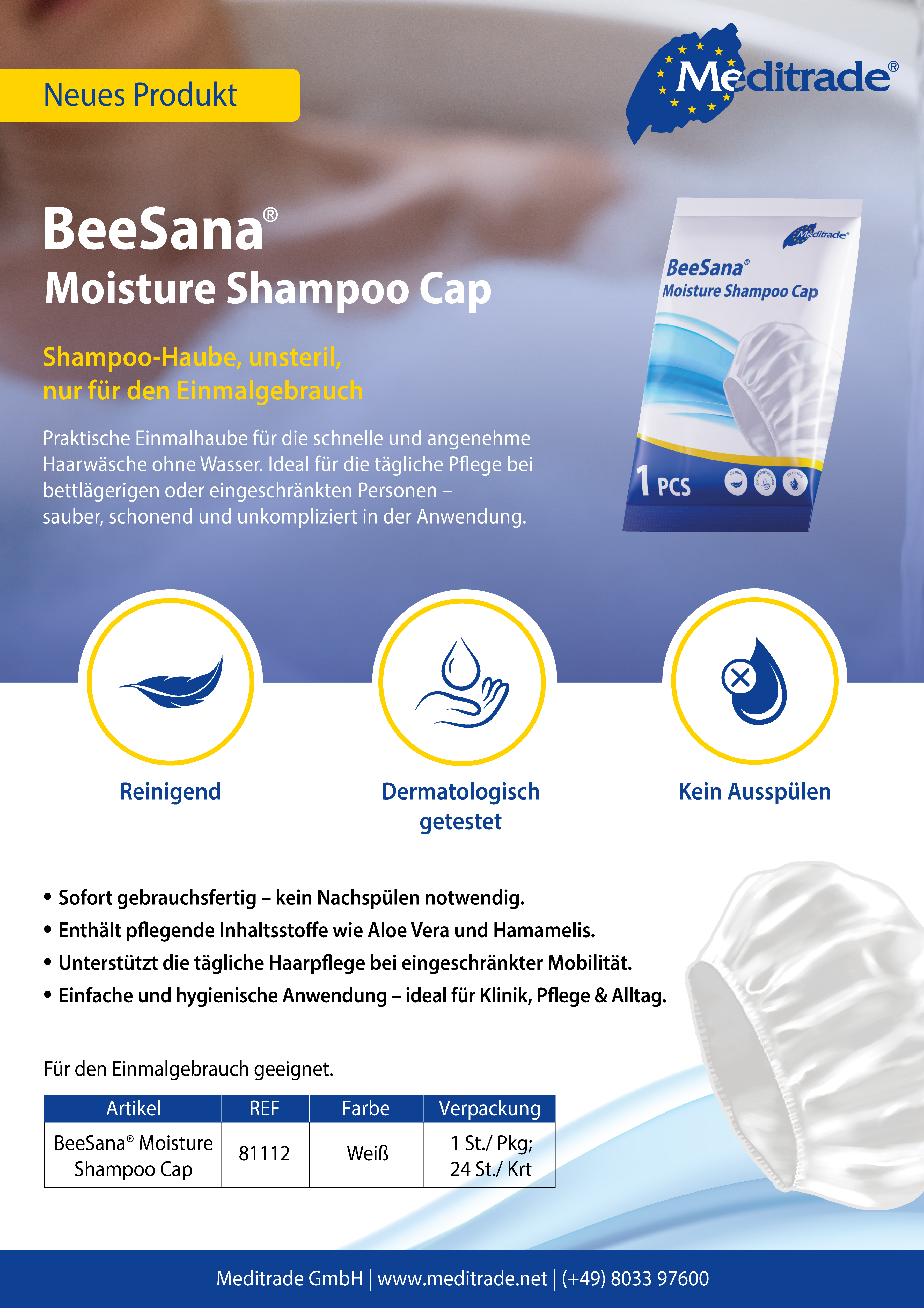 Die BeeSana® Shampoo-Haube ist eine gebrauchsfertige Einmal-Haube zur schonenden Reinigung von Haar und Kopfhaut – ganz ohne Wasser, Abspülen oder Abtrocknen. Sie wurde speziell für pflegebedürftige Menschen entwickelt, die aufgrund von Krankheit, Alter oder körperlicher Einschränkung Unterstützung bei der Körperpflege benötigen. Die Haube besteht aus einem weichen Vliesmaterial (50 % Viskose, 50 % Polyester) und ist mit einer milden Reinigungslotion getränkt, die Haar und Kopfhaut effektiv säubert, ohne die Haut zu reizen. Für eine angenehme Anwendung kann die Haube vor Gebrauch in der Mikrowelle (max. 700 Watt, max. 20 Sekunden) erwärmt werden – dabei ist die Temperatur sorgfältig zu prüfen. Die Anwendung ist einfach: Haube aufsetzen, 3 bis 4 Minuten sanft einmassieren, fertig. Ein Abspülen ist nicht nötig, das Haar kann im Anschluss direkt getrocknet oder gestylt werden. Die BeeSana® Shampoo-Haube ist latexfrei, für alle Hauttypen geeignet und nur zur äußerlichen Anwendung bestimmt. Sie sollte nicht bei offenen Wunden verwendet werden und ist nicht für die Wiederverwendung gedacht. Bei Säuglingen unter 6 Monaten sowie bei Schwangeren und Stillenden ist eine ärztliche Rücksprache empfohlen. Das Produkt hat eine Haltbarkeit von zwei Jahren und sollte kühl, trocken und lichtgeschützt gelagert werden.
