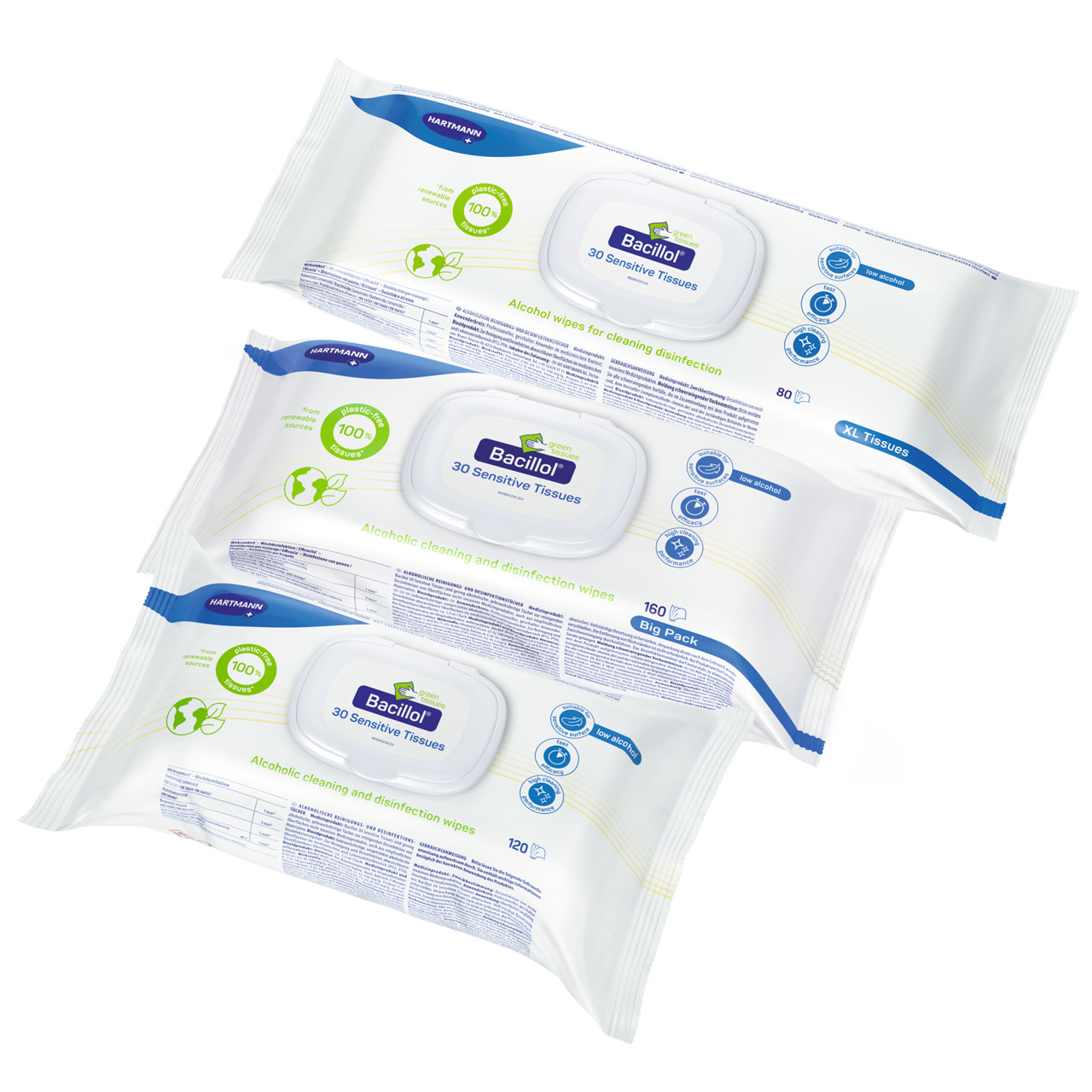 Bacillol® 30 Sensitive Green Tissues disinfectant wipes are an outstanding solution for fast and effective surface disinfection. They are characterized by their special material-friendly formula, which is gentle even on sensitive materials such as polycarbonate, acrylic glass and polysulfone. As a more environmentally friendly alternative, they are 100% plastic-free and free from microplastics. These disinfectant wipes offer first-class effectiveness and excellent cleaning properties, while at the same time being kind to the skin and allergy-friendly. They are designed for quick and time-saving application and can be used without gloves. Once opened, the wipes have a shelf life of three months, which supports their practical handling and long-term usability. The Bacillol® 30 Sensitive Green Tissues are supplied in a handy flowpack of 120 wipes for convenient and hygienic storage. With a wipe size of 17 x 20 cm and a coverage of 1.5 m² per wipe, they offer an efficient solution for surface disinfection in various application areas. The Bacillol® 30 Sensitive Green Tissues offer comprehensive protection against a wide range of microorganisms and viruses, which underlines their versatility and effectiveness. Overall, Bacillol® 30 Sensitive Green Tissues disinfectant wipes are a reliable and practical solution for surface disinfection in various medical facilities and other areas.