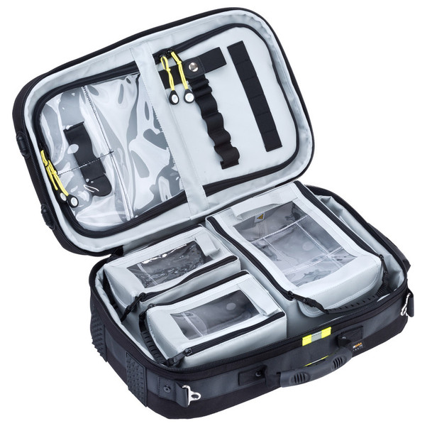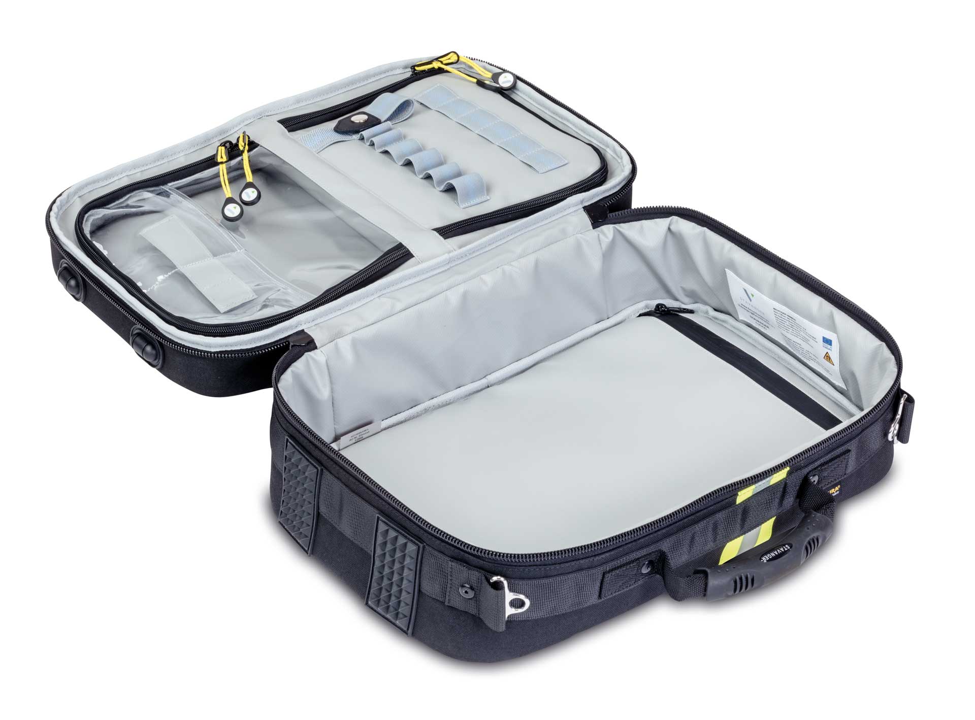 The right-hand side has an innovative magnet system for flexible loading of modules. The left-hand side has two fixed compartments - one of which is ideal for an AED with a viewing window, the other with rubber loops for structured storage.