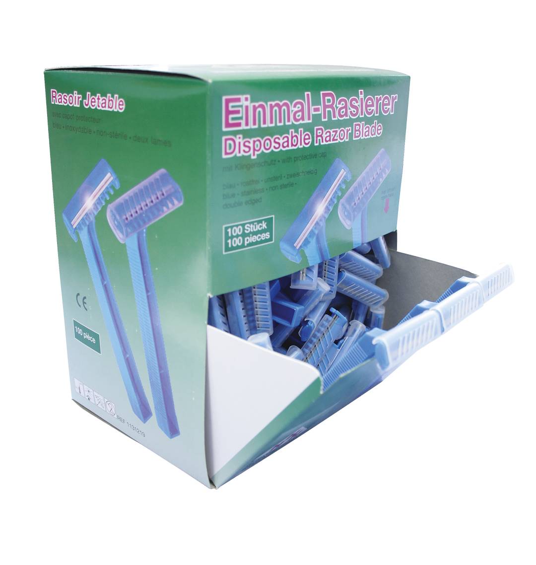 The Standard disposable razors are suitable for single use and have been developed for the medical sector, for use by medical professionals. The non-sterile blue disposable razors are double-edged and have a blade guard. The standard disposable razors from Herenz allow the patient to be shaved gently before surgical procedures or examinations. The blades are made of stainless steel and additionally Teflon coated and are ISO certified. The disposable razors are supplied in the dispenser box with 100 pieces.