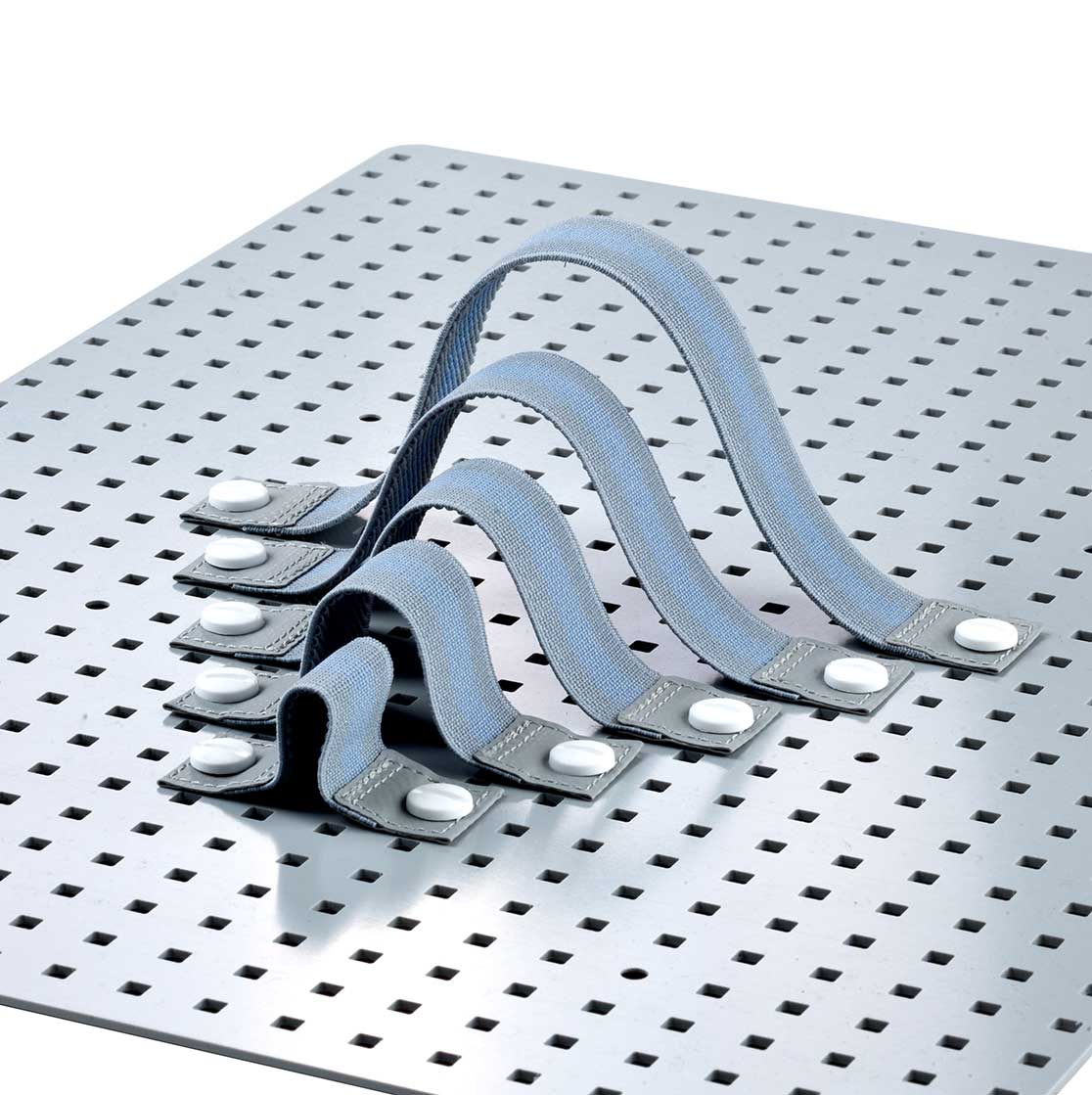 The LoopFlex is a 25 mm wide elastic band in different lengths and is used to fix other materials on a perforated plate. Holes are punched at both ends. By using a book screw, a stable and at the same time individual fixation is possible.