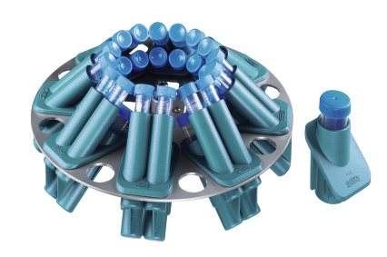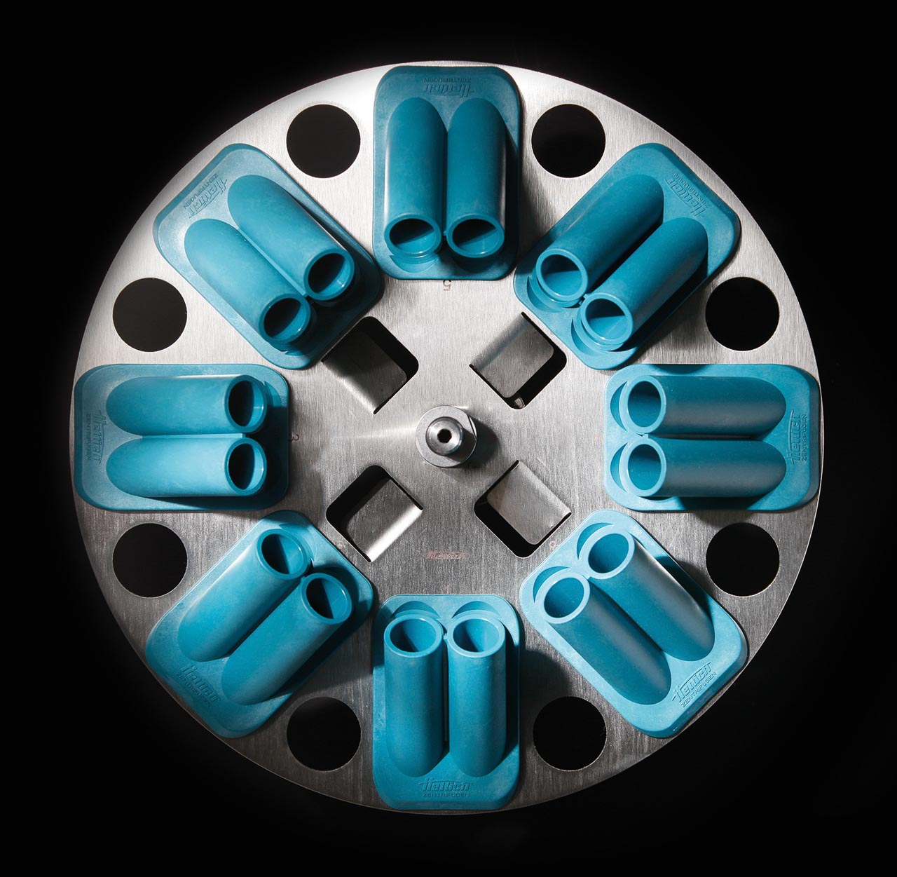 - n = 4.000 min-1 und max. RCF 2.594 (Rotofix 32A) bzw. n = 4.500 min-1 und max. RCF 3.283 (Universal 320/320R), mit Reduzierungen auch für kleinere Gefäße geeignet