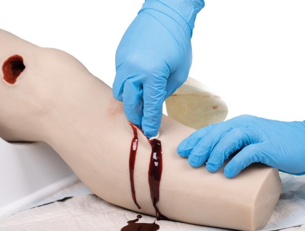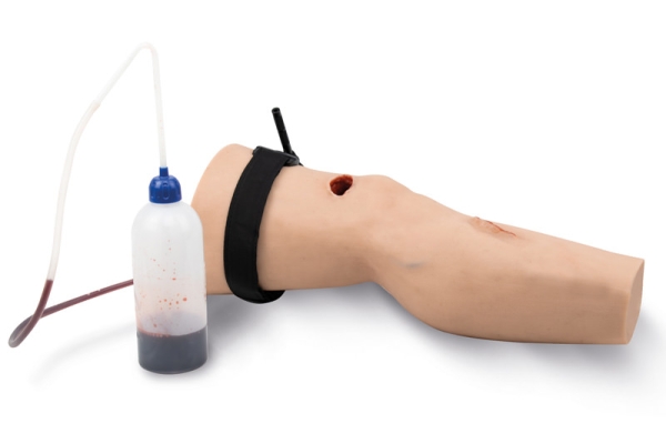 Üben Sie Erste-Hilfe-Maßnahmen und versorgen Sie eine größere Blutung mit dem Trauma Leg. Der Trainer stellt ein verletztes Bein mit Risswunde, Einschuss- und Austrittswunde dar. Sie können direkten Druck ausüben, die Wunde mit Gaze abdecken, einen Druckverband anlegen und ein Tourniquet anlegen, um die Blutung wirklich zu stoppen (Tourniquet nicht im Lieferumfang enthalten).
