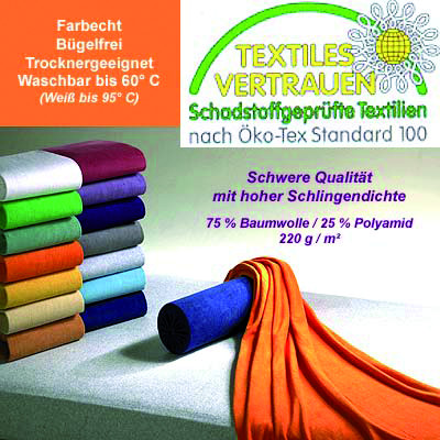 Der Diwan Liegenbezug passt mit einer großzügigen Größe von 195 x 65 cm auf jede Standart-Liege. Hergestellt wird der Liegenbezug aus hochwertigen Materialien, wie 75% Baumwolle und 25% Polyester. Die besondere Materialmischung verleiht dem Bezug nicht nur eine hohe Strapazierfähigkeit, sondern auch eine angenehme Geschmeidigkeit. Was den Liegenbezug wirklich einzigartig macht, ist der Stretch-Effekt. Dank einer speziellen Strickmethode passt sich der Bezug perfekt der Form der Liege an und bleibt dabei faltenfrei. Einmal angebracht, sitzt der Liegenbezug fest und sicher. Die saugfähige Oberfläche des Diwan Liegenbezugs sorgt für ein angenehmes Hautgefühl und absorbiert Feuchtigkeit schnell und effizient.