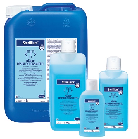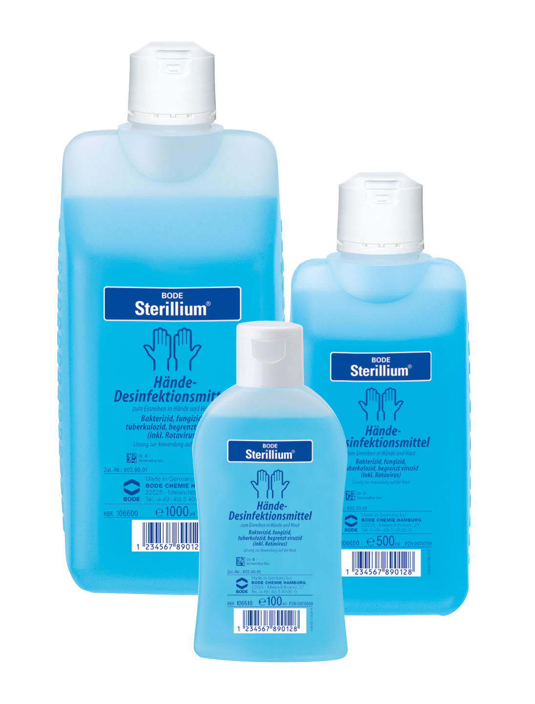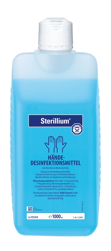 Sterillium von der Firma Bode ist eine gebrauchsfertige alkoholische Händedesinfektion, die eine sehr gute Hautverträglichkeit aufweist und ein sehr breites Wirkspektrum hat. Den pflegenden und rückfettenden Inhaltsstoffen ist es zu verdanken, dass sich das Händedesinfektionsmittel auch zur Langzeitanwendung bei Anwendern mit trockener Haut geeignet ist und sie erhöht sogar die Hautfeuchtigkeit. Sterillium hat sich seit über 50 Jahren auf dem Markt etabliert und ist sehr beliebt beim Einsatz in Arztpraxen, Krankenhäusern und auch bei Pflegediensten. Die praktischen Größen Aufteilungen ermöglichen eine Vielfalt an Einsatz Möglichkeiten, so kann zum Beispiel die 100 ml Sterillium Flasche perfekt in den Kittel gesteckt werden und ist damit immer Griff bereit und immer sofort einsetzbar. Sterillium lässt sich perfekt für die hygienische und chirurgische Händedesinfektion einsetzen. Durch den Sterillium Pumpaufsatz ist eine Abgabe der idealen Dosierung garantiert.