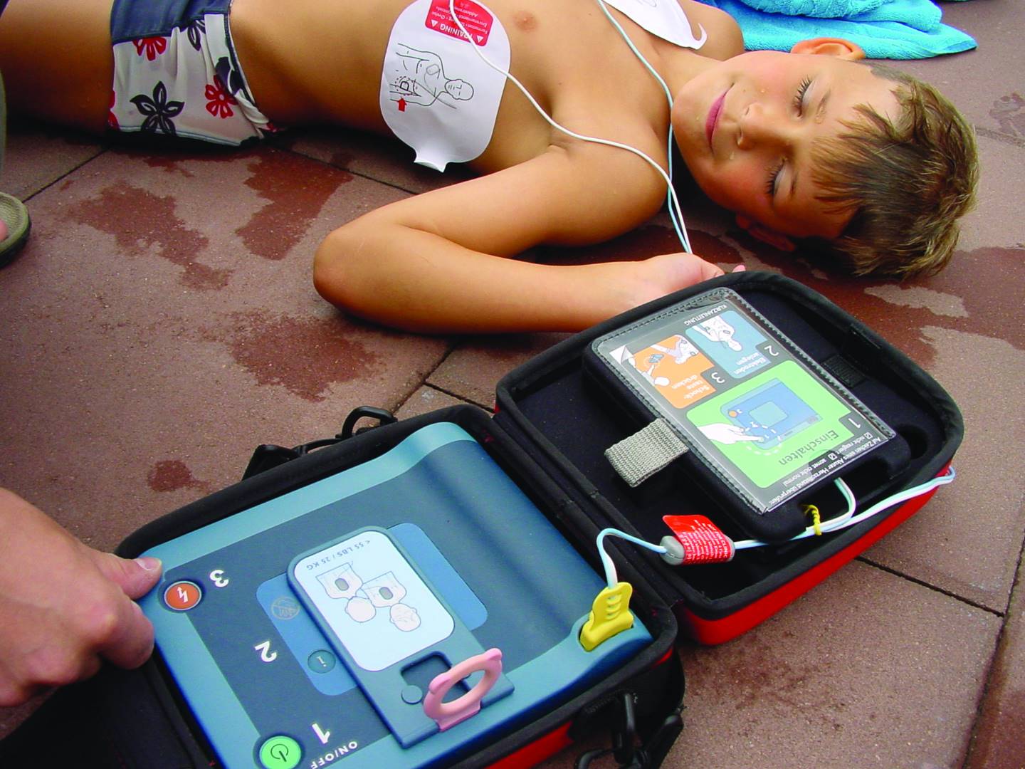 Sobald der Kinderschlüssel (nicht im Lieferumfang) in den FRx gesteckt wird, erkennt der Defibrillator, dass ein Kleinkind bzw. ein Kind behandelt wird. Der Defibrillator erteilt dann entsprechend angepasste Anweisungen zur Platzierung der Pads und zur Herz-Lungen-Wiederbelebung (HLW). Die Pads-Symbole blinken und zeigen dadurch an, wo die Pads aufzukleben sind. Außerdem wird die Defibrillationsenergie auf ein für Kleinkinder und Kinder (unter 25 kg Gewicht bzw. unter 8 Jahren) geeignetes Niveau reduziert.
