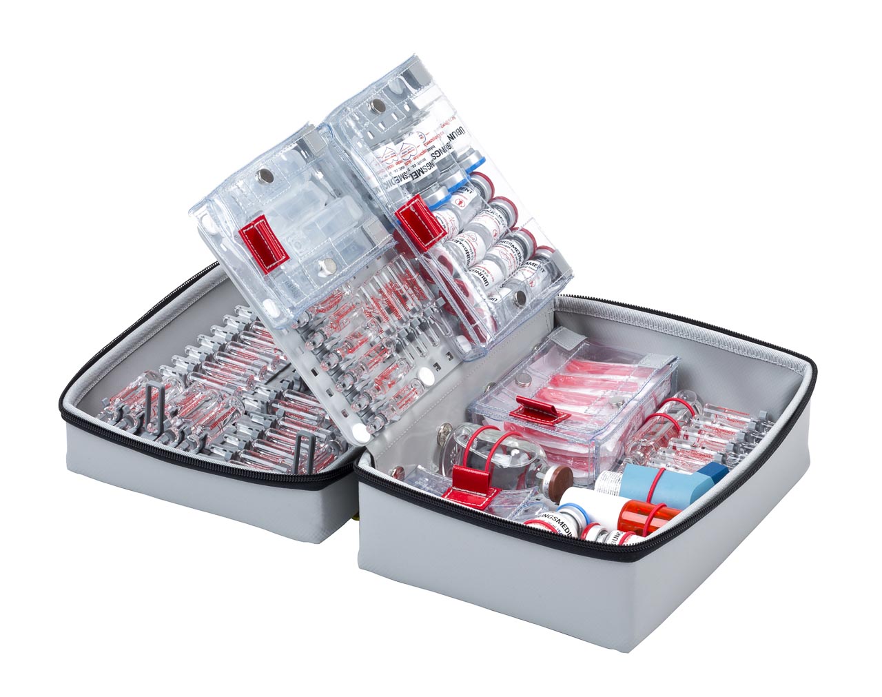 Mithilfe von Beschriftungsclips, die für eine Farbcodierung oder Wirkstoffaufklebern genutzt werden können, ist das Auffüllen nicht nur ein Kinderspiel, sondern reduziert auch Fehler. Die Farbaufkleber für die Beschriftungsclips gibt es in blau, grün, rot, gelb und weiß. Zusätzliche Materialien können entweder mit Hilfe von Gummibändern, den schmalen SingleFlex oder den breiteren LoopFlex, auf der Lochplatte fixiert werden, wie zum Beispiel Stechampullen und NaCl-Flaschen. Für Kleinteiliges, wie z.B. Spritzen oder Kanülen, bieten sich die Klarsicht-Folientaschen an, die es in unterschiedlichen Größen gibt, und ebenfalls auf der Systemplatte montiert werden können.