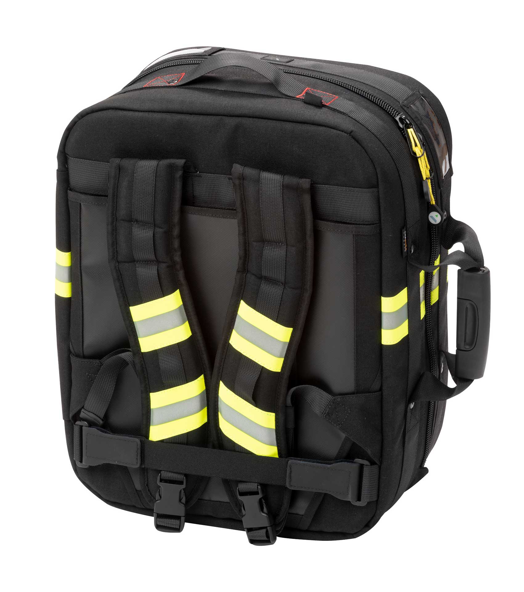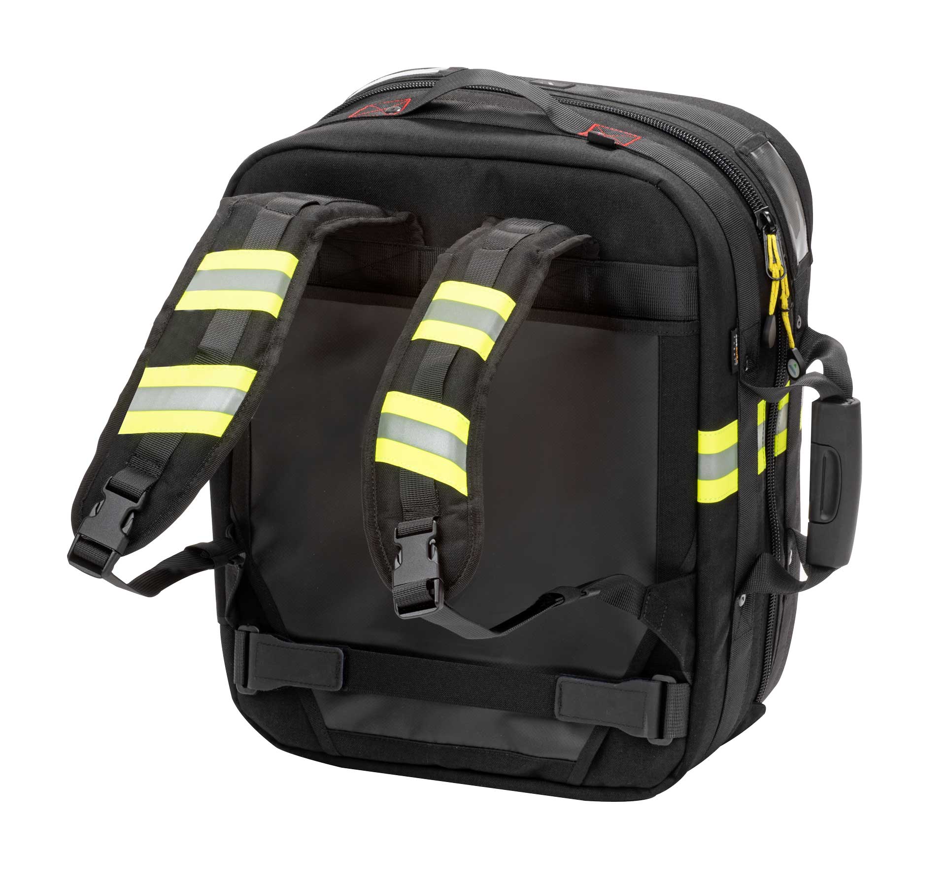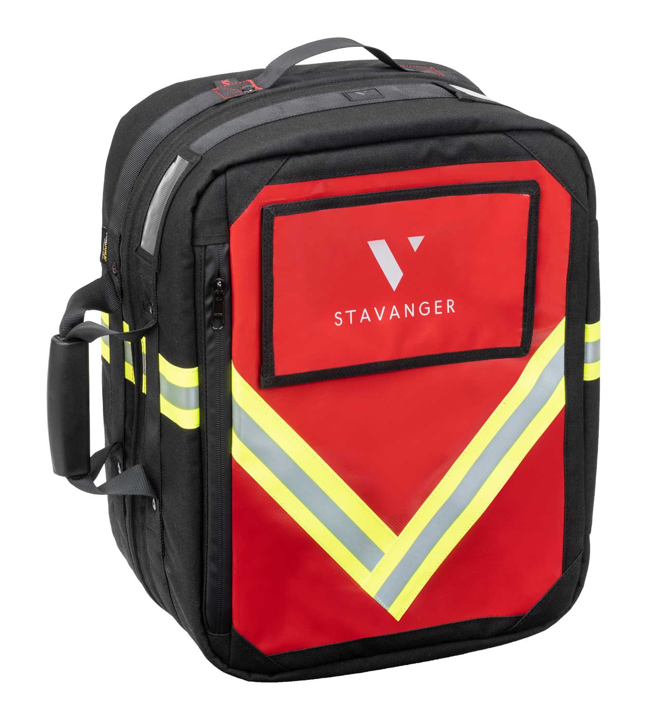 Das Tragesystem mit ergonomisch geformten Schultergurten, breiteren Schulterauflagen und einem zusätzlichen Rückenpolster erhöht den Komfort bei einem Notfalleinsatz. Zusätzliche Brust- und Bauchgurte sorgen auch auf längeren Strecken für einen optimalen Sitz. Zwei zusätzliche Griffe, den 2-teiligen Koffergriff aus PVC und den Behelfsgriff an der Oberseite, der gleichzeitig als Windenschlaufe für die Höhenrettung dient, ergänzen das Tragesystem. Der STAVANGER Rucksack ist durch seine zusätzliche Kantenverstärkung, dem doppelseitigem Keder am 2-Wege-Reißverschluss und durch die Verarbeitung von Original-CORDURA® insbesondere an den stark beanspruchten Stellen robust und strapazierfähig für den Alltag im Rettungsdienst.