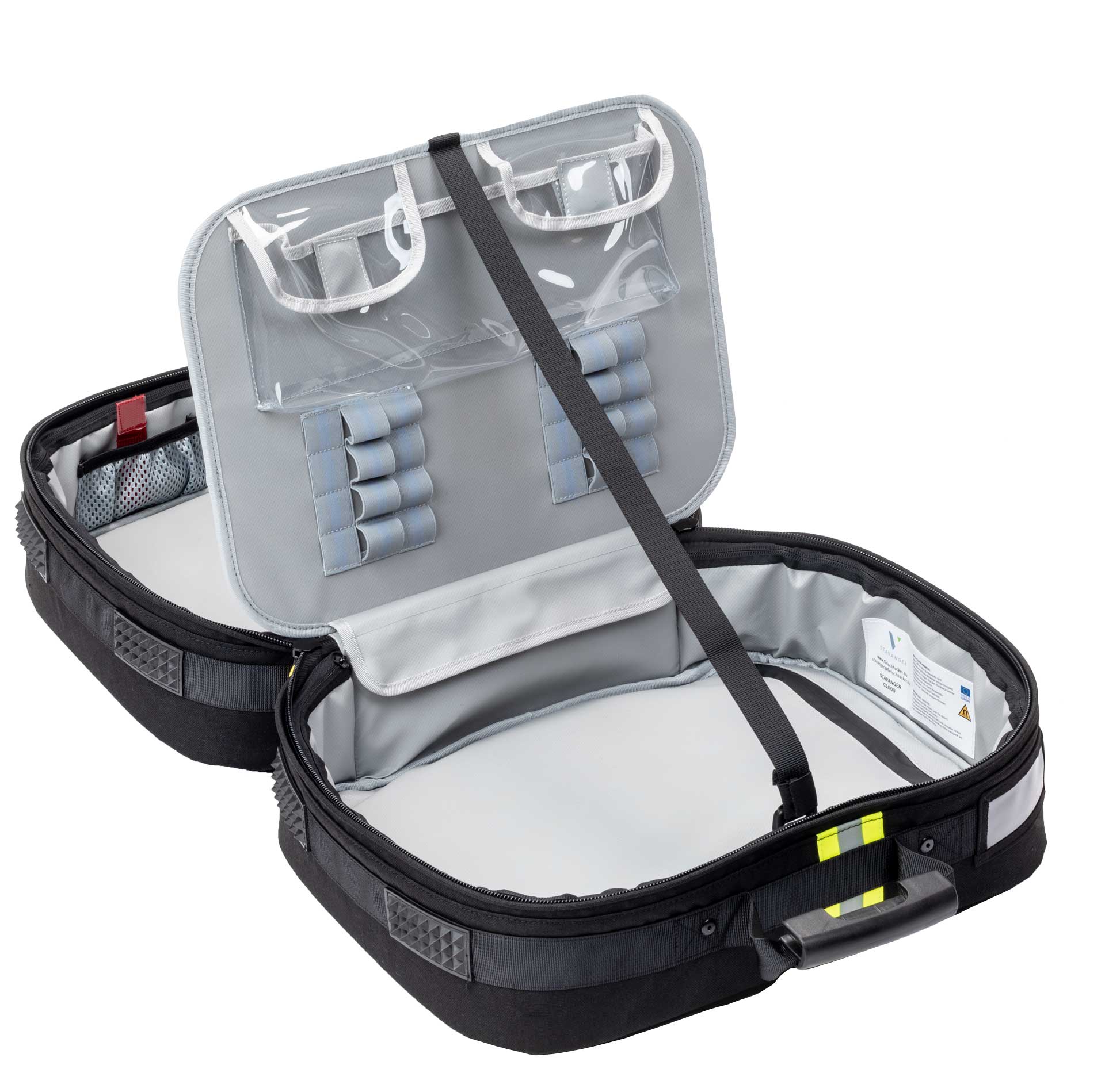 - Füllsortiment nach DIN-13155:2018-11 bestehend aus: Stifneck Select Immobilisationskragen, The BAG II Einwegbeatmungsbeutel für Erwachsene, je 1x Einweg-Gesichtsmaske plus für Jugendliche und Erwachsene, Guedeltubus Gr. 2, 3 und 4, Larynx-Tubus LTS-D Gr. 4 und 5, 100-ml Blockerspritze für Larynxtuben, Verbandmaterialsatz nach DI-13155:2018-11, je 2x Absaugkatheter CH 12, CH-14 und CH18, AEROsuc Manuelle Absaugpumpe, WESTMED Diagnostikleuchte,Flachkopf-Stethoskop und Blutdruckmessgerät für Erwachsene.