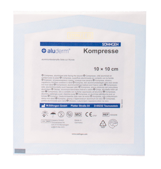 aluderm® Kompresse sind sterile Kompressen in einer Peelpackung die ab Produktionsdatum ca. 20 Jahre steril bleiben. Die Kompresse ist ideal für die Erste-Hilfe Versorgung von kleinen Wunden geeignet und wirkt besonders saugstark, so werden Blut und Sekrete sofort aufgenommen. Die Marke aluderm® steht für die perfekte Wundversorgung. Die aluderm® Kompresse ist besonders weich und geschmeidig und besteht aus einer aluminiumbedampften Wundauflage aus Polyestervlies, die verhindert, dass die Kompresse mit der Wunde verklebt. Die aluminiumbedampfte Wundauflage fasert nicht und unterstützt sogar die Hautbildung und Heilung. aluderm® Kompresse ist physiologisch unbedenklich und frei von optischen Aufhellern und frei von chemischen Bindemitteln.