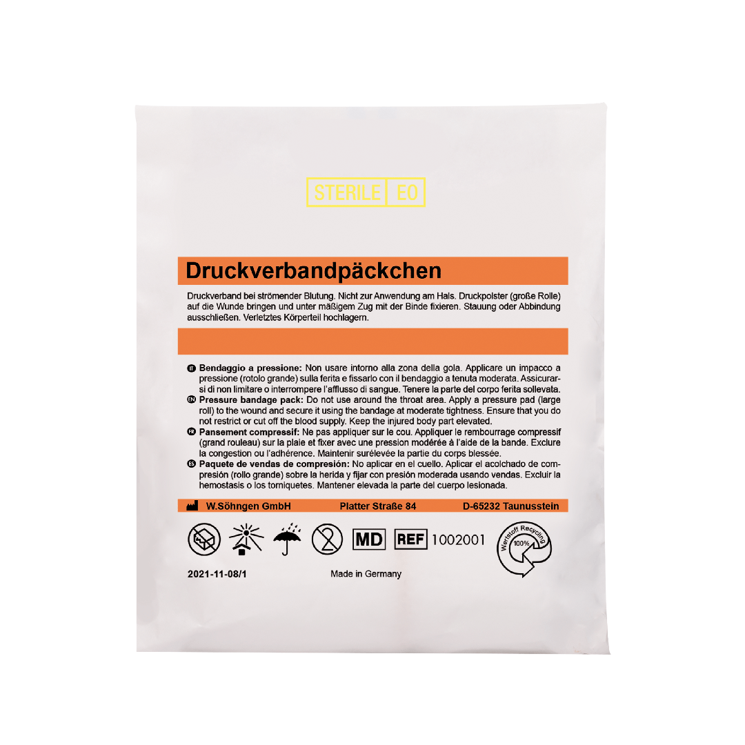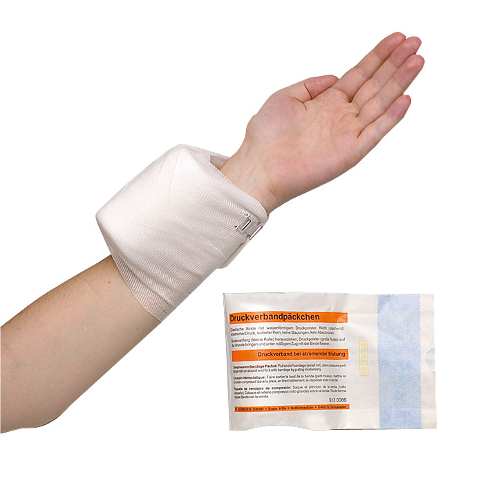 Spezial-Druckverbandpäckchen ist ein gebrauchsfertiger Druckverband, der im Gegensatz zu herkömmlichen Druckverbänden weder verrutscht noch sich verschiebt. Der große Vorteil an dem Spezialdruckverband ist, dass er auch durch nicht geschultes Personal einfach und problemlos angelegt werden kann. Der Spezial-Druckverband hat ein Druckpolster mit festem isoliertem Kern und sehr starken Sauglagen, so wird ein Durchbluten verhindert. Der Druckverband ist mit einer elastischen WS-Fixierbinde angenäht und sitzt außerordentlich sicher und rutschfest, ohne die Blutzirkulation zu behindern. Der Verband sorgt für einen Blutungsstillstand, ohne Stauungen oder Abschnürungen zu erzeugen. Der Spezial-Druckverband von W.Söhngen ist eine sichere und zuverlässige Methode zum Stoppen von Blutungen, ohne aufwendige Vorbereitungen zu treffen. Der Verband ist einzeln steril verpackt und besitzt einen orangenen Farbcode.